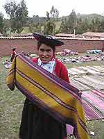 | Chinchero, the "birthplace of the rainbow" as it was known by the Incas is a highland community (approx. 12,500 feet elevation) about 30 miles outside of Cuzco. It has a very active community of weavers who have revived traditional and ancient techniques, abandoning modern equipment and yarns. Their mantas (shawls)are woven on backstrap looms, using hand-spun wools dyed by hand with traditional natural dyes. This is a much more difficult and time consuming way to produce their fine crafts, but the women are sincerely devoted to keeping the ancient skills alive. Some of the artists' groups also conduct classes and workshops for other weavers, including foreign visitors, the most important one being The Center for Traditional Textiles of Cusco where most of the following photos were taken. |